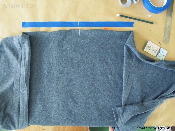 б)Обрезаем по пройме. Заметили скотч (малярный нужен, потому как здесь лента художника, она клеится не так сильно как скотч). Он нужен для того, чтобы трикотаж не растянулся и не свернулся в рулик.