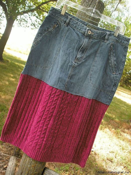 Хорошая идея для зимней юбки. Правда, цвет свитера не по мне, но это не самое важное. Мысль хорошая. А мы-то уж сделаем себе так, как захотим. А ещё таким же манером можно удлинить и старенькую джинсовую мини-юбочку
