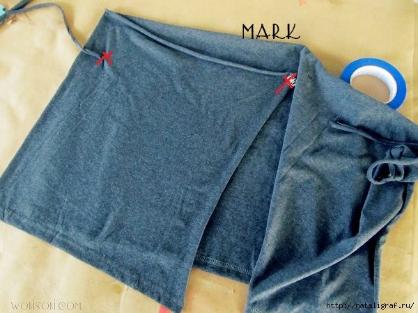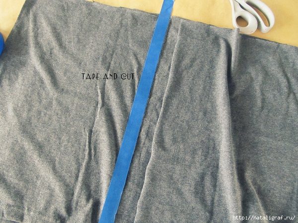 в)И вертикальные линии, конечно, тоже есть смысл укрепить от растяжки, если мы хотим иметь аккуратную юбочку.А вертикальная линия получится как только мы разрежем футболку. Мы должны получить три полотна: заднее широкое и два передних чуть Уже. Напоминаю: футболку берём большого размера или используем две одинаковых.