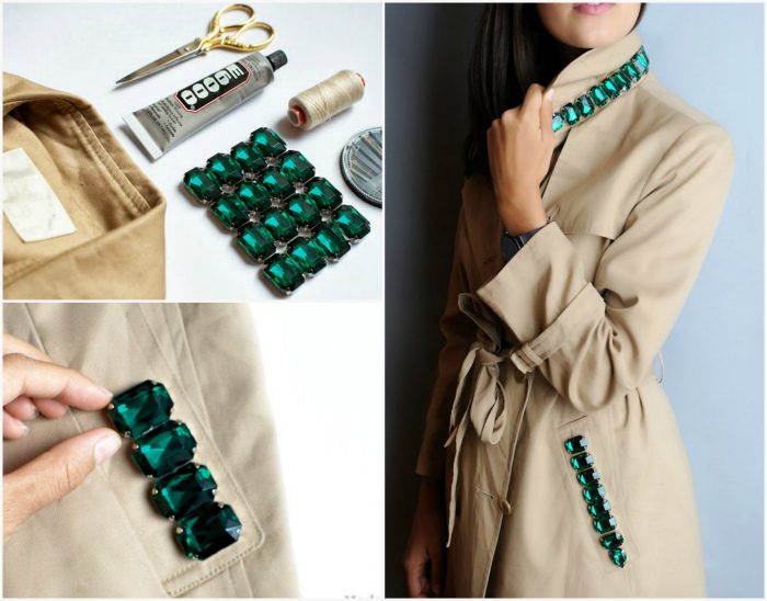 Плащ, который вы носите уже несколько лет кажется скучным и невзрачным? Не спешите выбрасывать его. Купите в швейном магазине новые пуговицы, фурнитуру и используйте их для декора воротника, манжетов и карманов плаща. Если вы творческая личность и не боитесь экспериментов, попробуйте креативно расшить плащ стразами и бусинами.