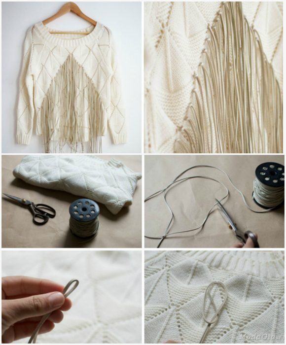 Светлый свитер с бахромой на спинке — один из трендов этого сезона, который можно легко сделать своими руками. Понадобятся только нитки или готовая бахрома на ленте, которую нужно аккуратно пришить к спинке свитера. Чтобы бахрома выглядела аккуратно и графично перед тем, как приступить к шитью, начертите сзади небольшой треугольник.