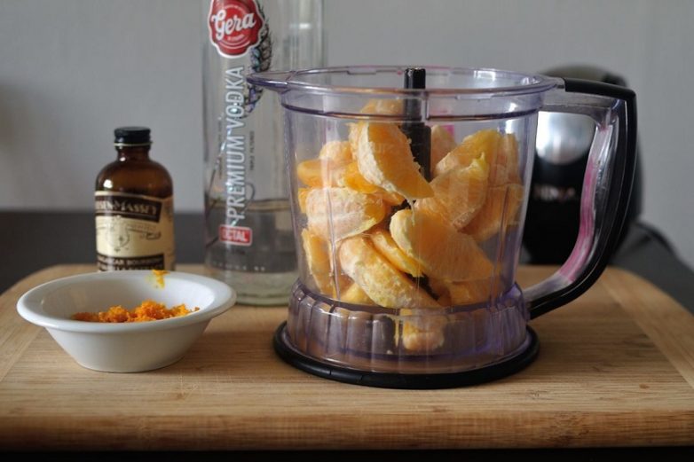 Через 2 часа выньте апельсины из холодильника. Возьмите блендер и измельчите дольки с сахаром, ванильным экстрактом, цедрой и водкой. На этом этапе добавьте только 200 мл сливок (10%-й жирности).