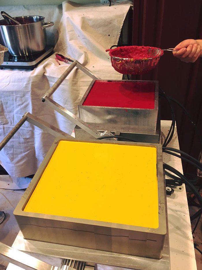 Затем заливает смесь в специальные формы.
