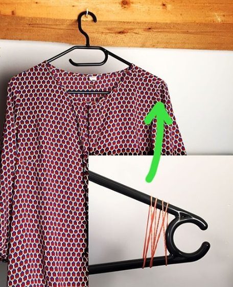 Повесить на вешалку-плечики тонкую блузку — тот еще квест. Чтобы с ним справиться, попробуйте закрепить на краях вешалки резинки, как показано на фото.11. Быстро превратить простенькую майку в стильную вещицу