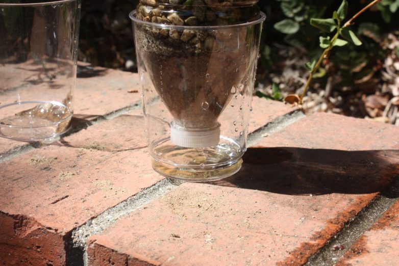 В данном случае мы пробиваем отверстия в крышке нашей бутылки. Понадобится 3-4 дырки, достаточно большие, чтобы через них свободно протекала вода, но не такие большие, чтобы через них проваливались фильтрующие материалы.