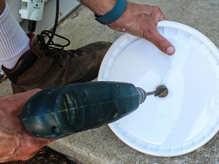 С ведра снимите крышку и в ней просверлите отверстие ровно посередине. Его диаметр должен быть равен ручке вантуза. Если под рукой нет дрели (что в условиях похода весьма предсказуемо), то дырку в пластике можно пробить упомянутой ручкой.