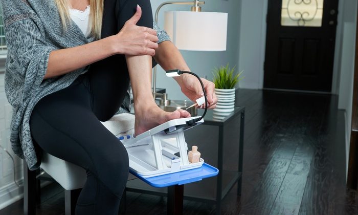 Можно привнести «свежую струю» в домашний педикюр с помощью данного набора «все-в-одном», который включает в себя подставку для ног, чтобы педикюр можно было комфортно делать прямо на диване или кровати, все необходимые инструменты для ногтей, светодиодную подсветку и выдвижной лоток, чтобы не запачкать все вокруг. Есть даже плюс вариант с сушилкой для ногтей.