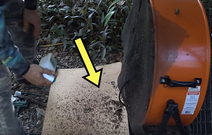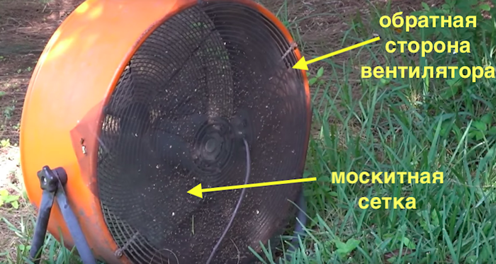 Парень достал мощный вентилятор и установил его на участке (место особого значения не имеет). С обратной (задней) стороны фермер накрыл его обрезанным по размеру куском москитной сетки, прикрепив её магнитами. Вентилятор станет ловушкой для комаров, а сетка не даст им провалиться вовнутрь устройства.