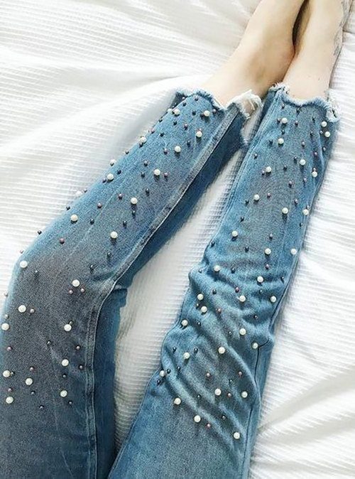 Жемчуг и всевозможные бусины — еще один прекрасный способ задекорировать джинсы. Они давно стали мелькать в магазинах и в масс-маркетах, но при желании подобную стильную вещь можно организовать самостоятельно, подключив к делу безграничные просторы фантазии и свои золотые ручки.3. Краски