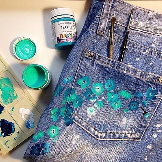 Другой весьма интересный вариант: превратите свои джинсы в полотно, вооружитесь специальными красками и кистью, а дальше — что ваше чутье художника прикажет. Можно вдохновиться примерами других оригинальных модников, используя трафареты или вырисовывая цветочки. Ну или просто подражайте Поллоку, разбрызгивая краску.