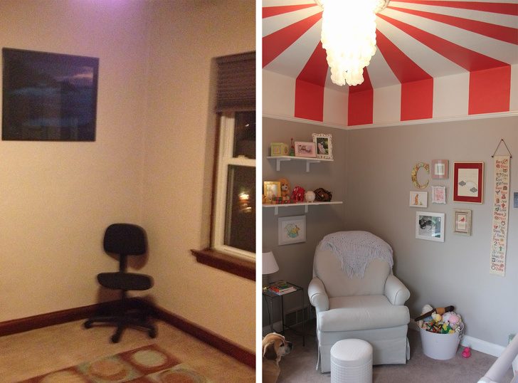 Превратить стандартную комнату в цирковой шатер несложно: вам потребуются красная краска, малярный скотч и немного терпения.Три в одном