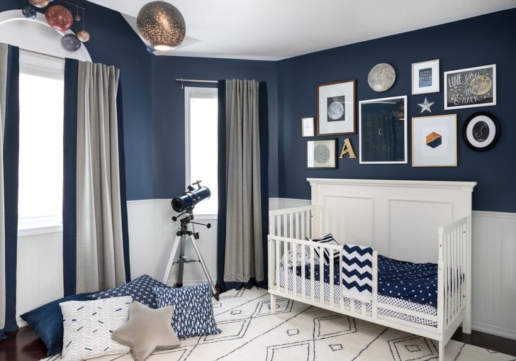 Сочетание темно-синей стены, изображения медведя, который словно включает планету, и золотых и серебряных звезд способно превратить стандартную детскую в настоящий сказочный мир.