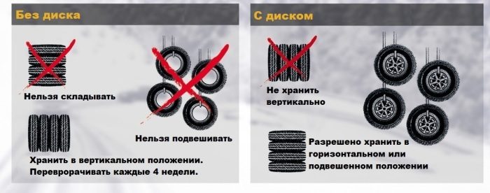 При переходе, скажем, с зимней на летнюю резину очень важно зимние колеса правильно поставить на хранение. Если шины на дисках, то их нужно складывать горизонтально одну на другую или подвешивать. Покрышки без дисков нужно хранить в вертикальном положении, меняя точку опоры каждый месяц.