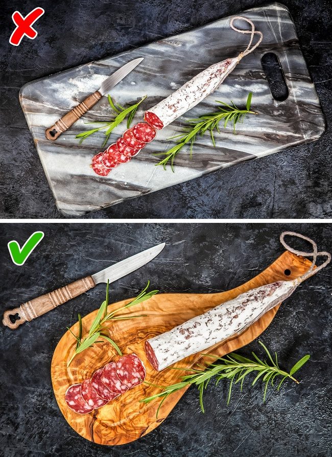 Обсудим материал для разделочной доски. Утварь из мрамора и гранита долговечна, да и смотрится эффектно. Гигиеничность — важное преимущество стеклокерамики. Вот только эти материалы способствуют быстрому износу лезвия ножа. Необязательно отказываться от досок из камня или стекла. Просто будьте готовы дополнить перечень характеристик любимого ножа эпитетом «тупой».