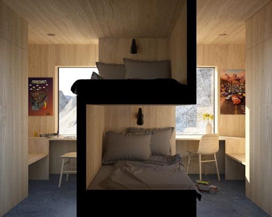Эту двухъярусную кровать придумали в студии Vardehaugen, и она совершенно не похожа на обычные двухъярусные кровати. Спальные места этой кровати расположены друг над другом, но в разных комнатах. Поэтому ее можно использовать не только для сна, но и для зонирования пространства.