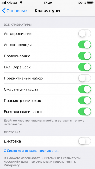 В iOS не так много подобных настроек, но поведение системы при наборе текста всё же можно немного изменить. Откройте «Настройки» → «Основные» → «Клавиатура» и внимательно просмотрите подписи к тумблерам. Далеко не всё из того, что там есть, нужно большинству пользователей. Если предиктивный набор только сбивает с толку, а автокоррекция замедляет набор — смело отключайте их.