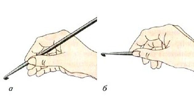 Существует два основных способа держать крючок: снизу — как ручку (рисунок а) или сверху — как нож (рисунок б). Способ, который вы выберете, не влияет на итоговый результат вязания. Делайте так, как удобно вам.