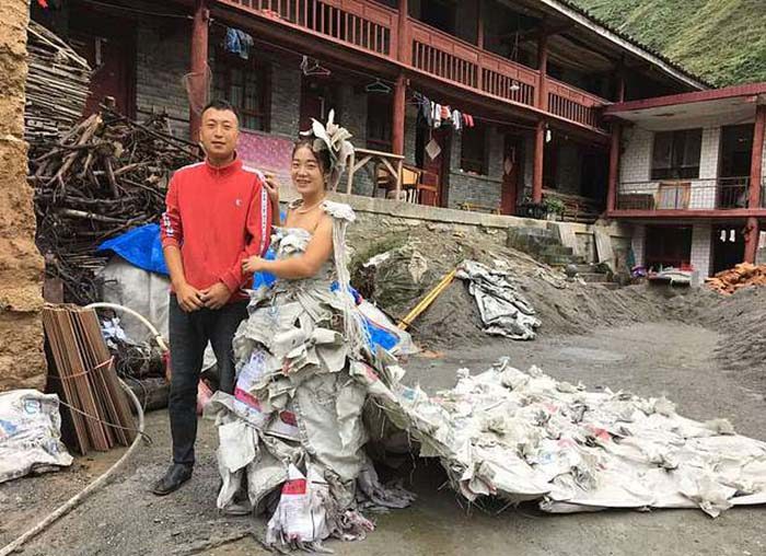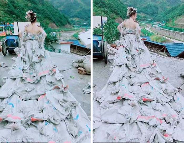 Экстремальная экономия или хайп? Китаянка сшила свадебное платье из мешков
