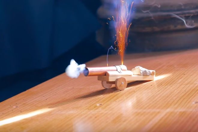 Можно обойтись и вовсе без пороха. Для такой маленькой пушки хватит и серы, собранной со спичечных головок. Осталось вставить фитиль и орудие готов к выстрелу.