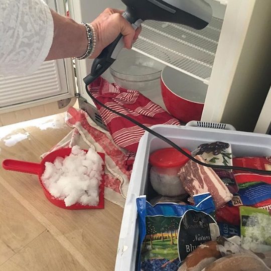 Один из альтернативных способов размораживания также заключается в применении фена. Когда есть необходимость в использовании только некоторого количества продуктов из брикета, можно нагреть требуемую их часть феном, а затем легко отделить от основной заледеневшей массы.