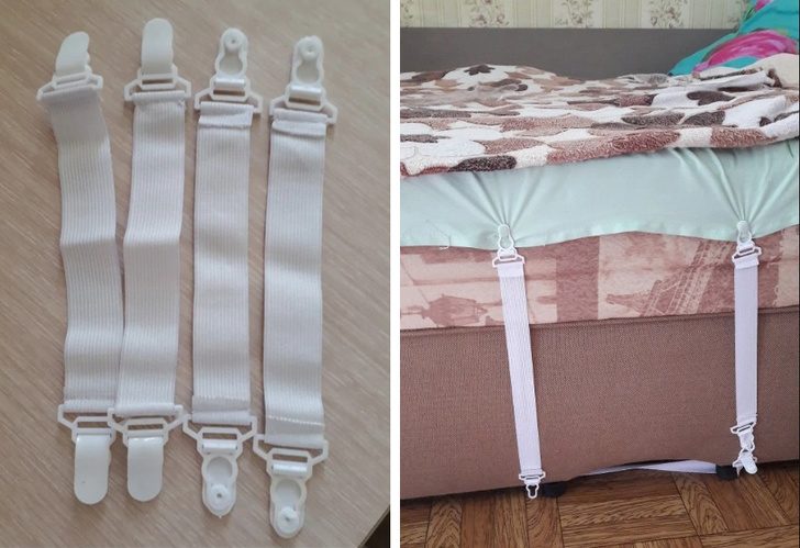 Вместо того чтобы переплачивать за простыни на резинке, которые почти невозможно найти в комплекте постельного белья и приходится покупать отдельно, можно просто приобрести держатели. Это съемные универсальные резинки с зажимом, они избавляют от хлопот и экономят бюджет.