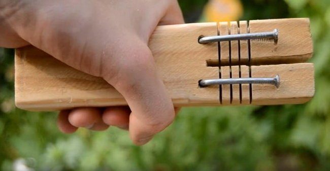 Забиваем два гвоздя и загибаем их. Вот так: