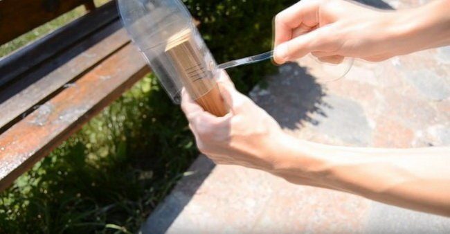 Отрезаем у пластиковой бутылки дно и одеваем ее на наше новое приспособление. Режем бутылку в ленту.