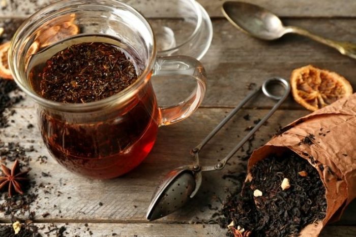 Для приготовления этого пирога действительно нужно заварить чай. И не только для настроения, заварка и есть тем секретным ингредиентом, который добавляли в выпечку еще наши бабушки, чтобы она была особенно вкусной. На 2 пакетика – стакан горячей воды.