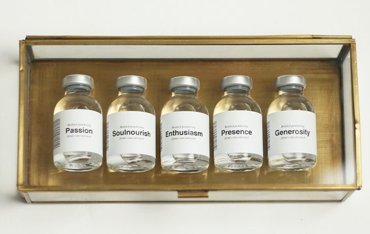 «Страсть». «Духовная пища». «Энтузиазм». «Близость». «Щедрость».В 2004 году в Дании успешно стартовал проект Flowmarket, который предлагает своим покупателям купить прощение, щедрость, счастье, внутреннюю красоту, чувство юмора и много других приятных вещей в баночках всего за € 8. В продаже есть даже коллекция «темной материи»: обида, страх, неуверенность, стресс, зависимость. Ведь первый шаг на пути к трансформации — признать свои слабости.