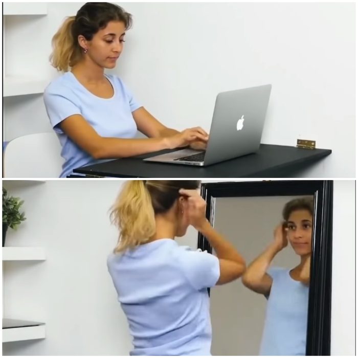 Такое дизайнерское решение обеспечивает сразу двойную экономию: денег и свободного пространства. Письменным столом мы пользуемся не постоянно, так почему бы не объединить его вместе с зеркалом в одно целое? Рациональное решение легко оформить: столешница из ДСП крепится к стене рояльными петлями, а с другого края к ней прикрепляется зеркало с рамой идентичных размеров. Когда вы работаете за ноутбуком, рама с зеркалом выполняет роль ножки, а после выполнения работы вся конструкция собирается и закрепляется на стене с помощью задвижки. Пространство освобождено, а на стене красуется только зеркало.