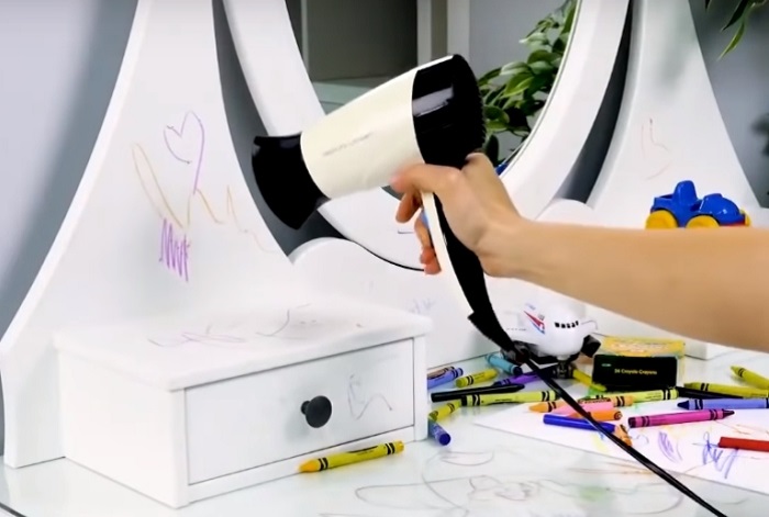 Обычно маркер на мебели оборачивается катастрофой. Избежать проблемы по замене поможет простой способ. Чтобы маркер легко стирался с помощью влажной тряпки, его нужно предварительно подогреть. Все цветные линии прогреваем горячим воздухом из фена, а потом стираем без особых усилий.
