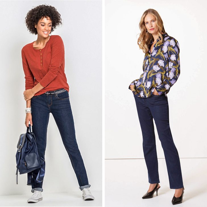 Мода на джинсы меняется практически каждый год: сегодня в моде «мамины» джинсы, а завтра они теряют актуальность и на смену им приходят скинни. Однако прямые джинсы классического кроя с обычной посадкой (линия пояса проходит чуть ниже пупка) никогда не теряют актуальности. Универсальные джинсы должны быть темно-синего цвета без потертостей и прочих «дефектов» и, само собой, не укороченными.