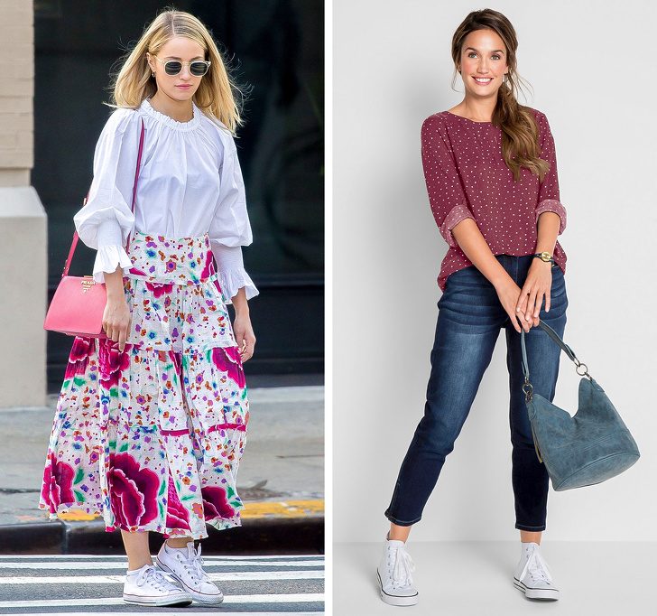 С чем носить: Белые кеды могут быть частью очень женственного образа, ведь их можно сочетать и с широкими юбками с цветочным принтом, и с платьями в бельевом стиле. Кедами можно дополнить и комплект из денима, и классический костюм, и элегантный наряд со смокингом. А вот создание образа в спортивном стиле требует определенных навыков и умения балансировать на тонкой грани между вкусом и безвкусицей.