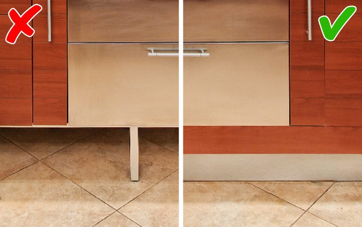 Если вам захотелось сделать красивые ножки у ящиков и не подшивать низ, стоит задуматься. Это приведет к необходимости постоянной уборки, накоплению пыли и закатившимся в дальний угол предметам. Поэтому лучше заказать цоколь для кухни — это планка, которая крепится к ножкам гарнитура.