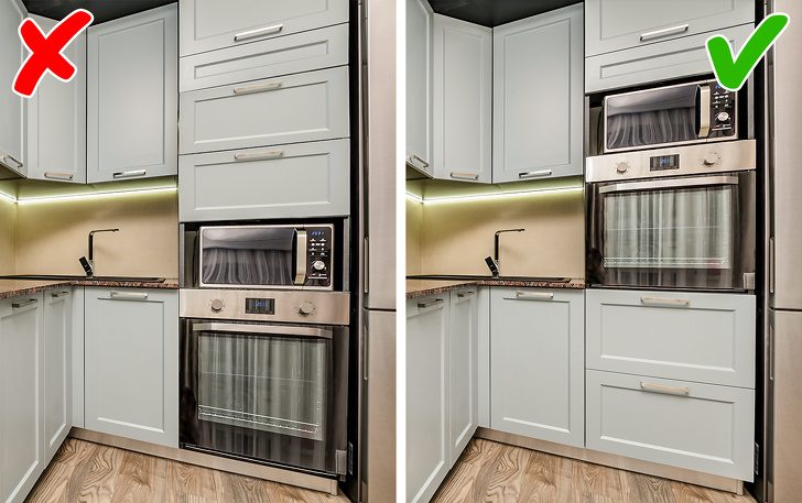 Не стоит размещать кухонную технику слишком высоко или низко. Ориентируйтесь на свой рост, лучшая высота — на уровне вашего пояса. Например, духовку лучше расположить на большей высоте от пола, нежели мы привыкли. В таком случае вам не придется все время нагибаться, чтобы ее открыть.2. Тяжелые шкафы на легких стенах