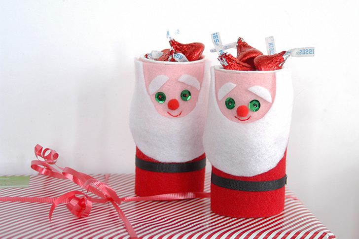 Милых Санта-Клаусов можно сделать из картона и фетра любого размера. Используйте их в качестве оригинальной упаковки для конфет.