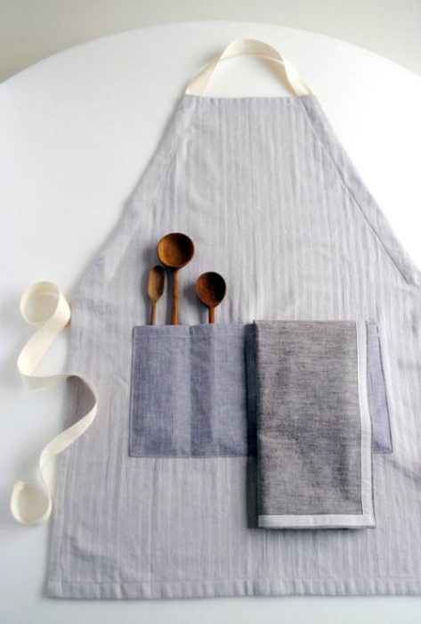 Простой фартук с карманами для столовых приборов, салфеток и полотенца, станет не только вашим защитником от брызг и пятен, но и «союзником» на кухне.