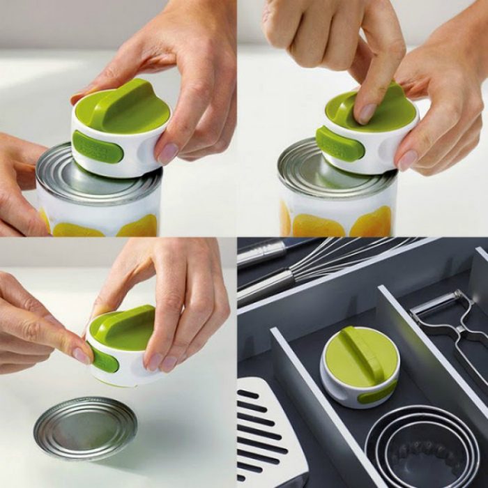 Если вы до сих пор мучаетесь со старой открывалкой советского образца, пришло время сменить ее на новый функциональный нож. Компактное устройство Joseph Joseph с помощью одного нажатия надежно крепится на крышке банки, далее нужно несколько раз прокрутить ручку до полного снятия крышки.