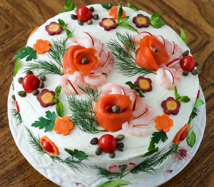 Иногда, чтобы блюдо стало красивым, нужно просто добавить несколько контрастных деталей. Например, украсить майонезную верхушку розочками из лосося, креветками, цветами из моркови, кусочками помидоров черри и веточками зелени. Можно заменить колбасу на красную рыбу или креветки.