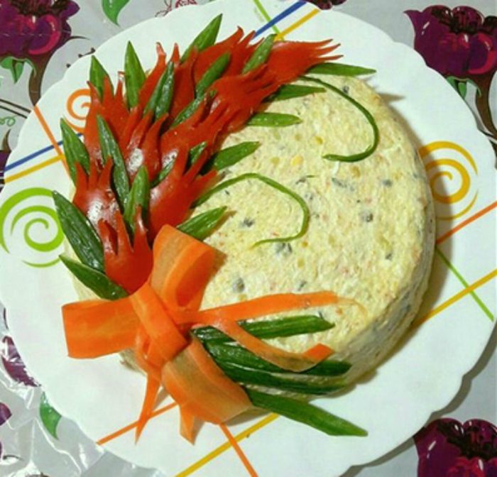 Классический салат оливье, верхняя часть которого равномерно помазана майонезом и украшена фигурками в виде цветов. Для создания этого простого и оригинального украшения понадобились фигурно нарезанные огурцы, морковь и болгарский перец.