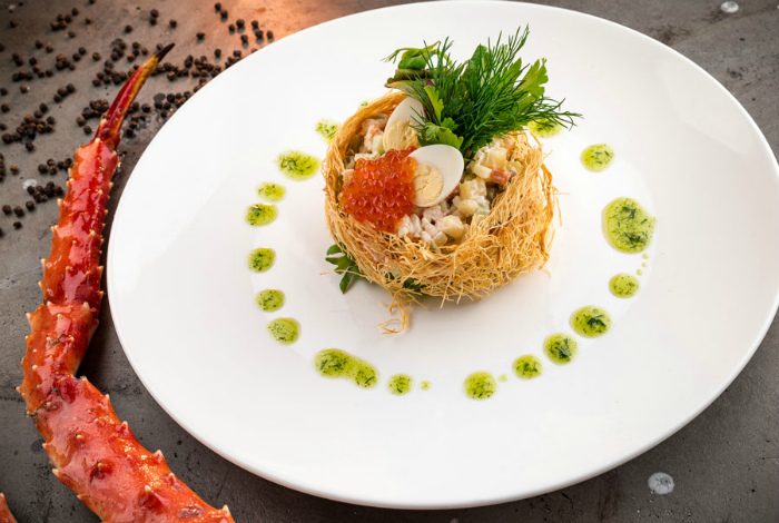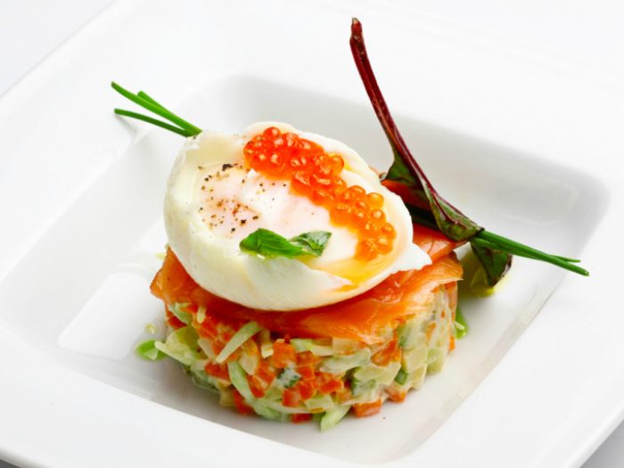 Раньше салат оливье считался одним из самых доступных. Но сейчас существует масса интерпретаций классического рецепта. Поэтому никто не запретит вам сделать свое оливье роскошным, заменив докторскую колбасу на утку, лосося или креветки. Ну а роскошному блюду, нужна и соответствующая презентация. Украсьте верхушку тонкими слайсами слабосоленого лосося, добавьте веточку зелени, а сверху выложите яйцо пашот и немного икры.
