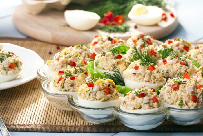 Подавать салат можно не только в тарелках, но и в половинках, сваренных вкрутую яиц. Учитывайте, что подобный вариант оформления подразумевает очень мелкую нарезку.