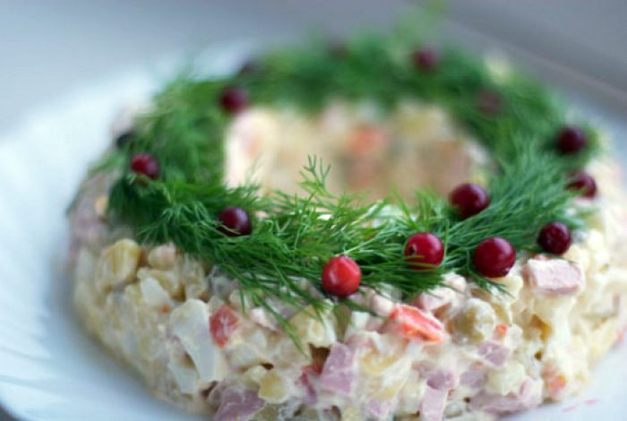 Для реализации этой идеи сначала нужно придать салату форму кольца. Сделать это удастся при помощи соответствующей формы для выпечки. Верхушку следует украсить веточками свежего укропа и ягодами клюквы.