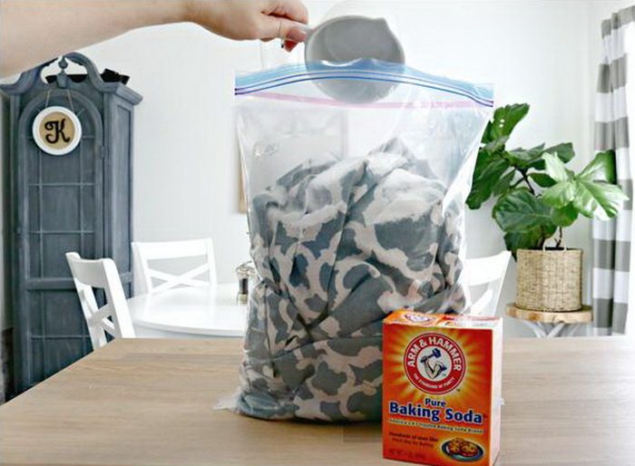 На этот раз понадобится сода и большой полиэтиленовый пакет (желательно с герметичной застежкой). В пакет нужно положить занавеску или коврик, засыпать чашку соды, тщательно потрусить, чтобы вещество распределилось равномерно и оставить на 7-8 часов. Затем — выстирайте вещи в соответствии с инструкцией по уходу.