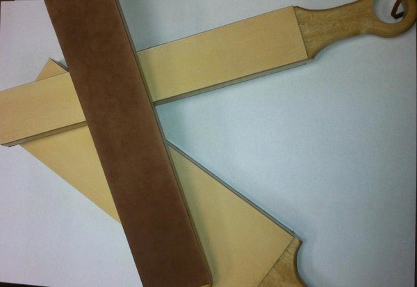 Для изготовления приспособления для доводки понадобится небольшая дощечка и кусочек натуральной кожи. У меня дощечка величиной с сигаретную пачку, а кожа натянута с помощью четырёх винтов на торцах. Можно кожу приклеить специальным клеем. Готовое изделие смазывается по коже пастой ГОИ, после чего можно приступать к работе.