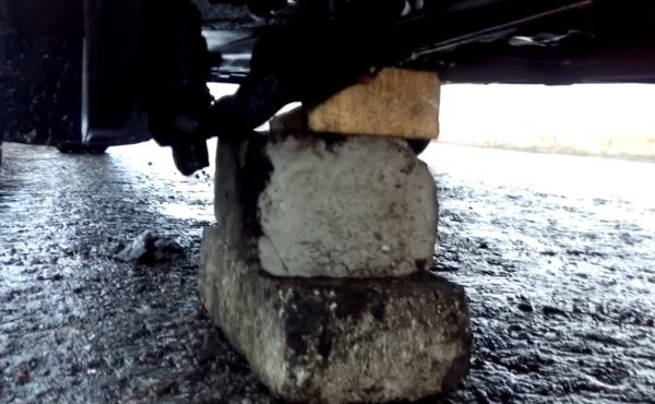 — Затем быстро под нижний рычаг нужно подложить несколько плоских предметов, чтобы они плотно в него упирались. Можно использовать дерево либо кирпичи, плоские камни.