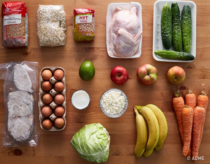 гречка овсянка нут курица огурцы рыба десяток яиц 1 авокадо яблоки капуста бананы морковь кефир творог Вышло даже дешевле, чем мы планировали потратить изначально, — 913 рублей.