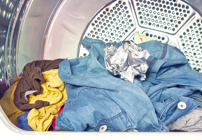 Комкаем из фольги шар размером с кулак и помещаем его в барабан стиральной машины. Такая хитрость позволит снять все статическое электричество с только что постиранных вещей. Шар можно использовать повторно.