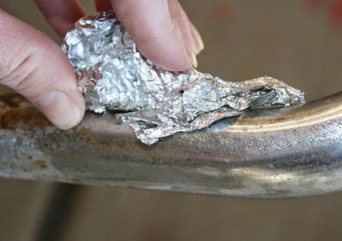 Фольга является неплохим средством от ржавчины. Достаточно взять смятый кусочек материала и потереть им по проблемной поверхности. Можно таким образом даже бампер автомобиля почистить.