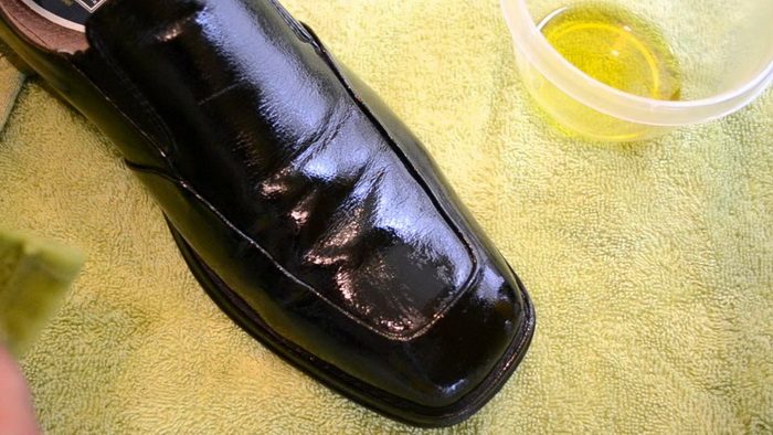 Если обувь лакированная, то царапины на ней будут появляться гораздо чаще, но и избавиться от них будет просто. Можно воспользоваться лаком для ногтей того же цвета, что и обувь, или прозрачной основой. Вначале обезжирьте место, где появилась досадная царапина, при помощи слабого водного раствора с моющим средством для посуды. Затем – нанесите лак, дайте хорошо просохнуть.